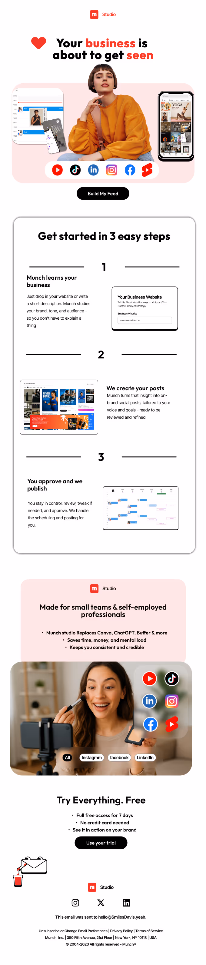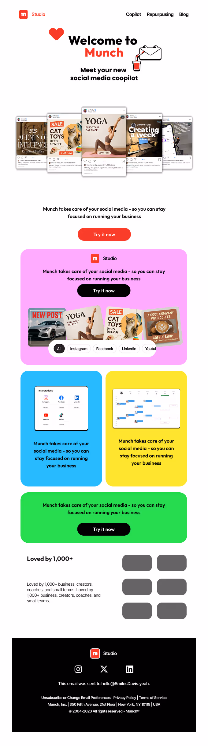 We reverse-engineered every competitor—tone, visuals, microcopy—and rebuilt Munch’s brand voice from scratch. Custom language. Zero generic stocky design templates. Designed to stand out.